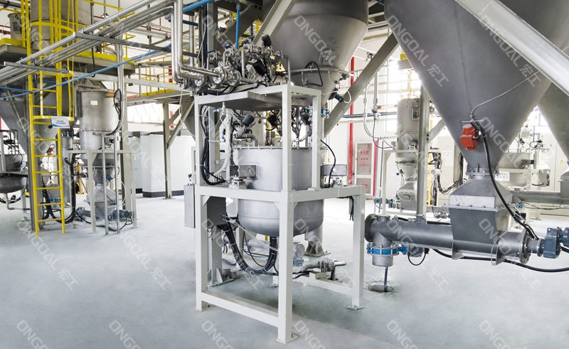 在投料环节,针对不同物料特性设计差异化处理方案:通过负压长距离输送系统有效解决氢氧化铝高温物料的输送安全,利用风冷技术将物料温度降至工艺要求范围;氧化锌与白炭黑采用配备单点除尘装置的小袋解包站,彻底消除人工投料时的粉尘逸散问题,其中白炭黑更采用隔膜泵输送技术突破轻质粉体易漂浮的输送瓶颈。